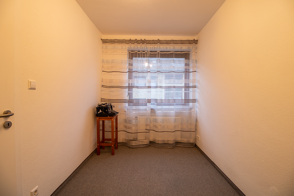 Vom zentral gelegenen Flur aus sind die wesentlichen Räume der Wohnung direkt zugänglich. Das helle Wohnzimmer bildet den Mittelpunkt der Wohnung und bietet direkten Zugang zur Loggia. Von hier aus erschließt sich zudem ein weiteres, etwas kleineres Zimmer, das sich ideal als Büro, Gäste- oder Kinderzimmer nutzen lässt.