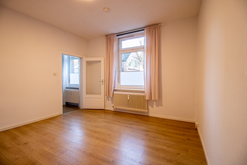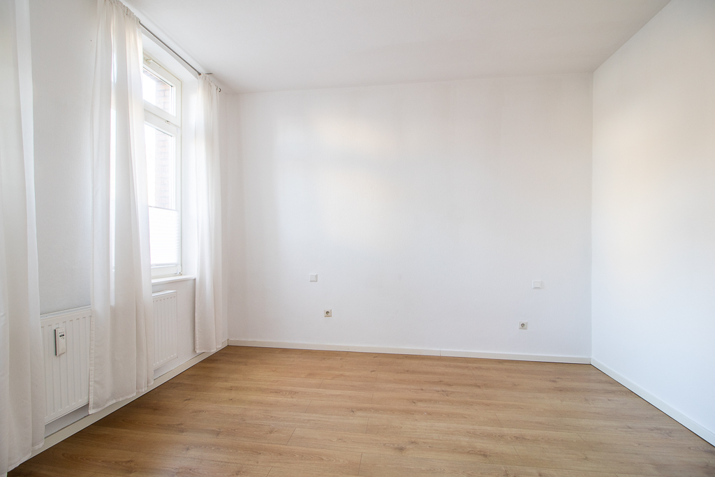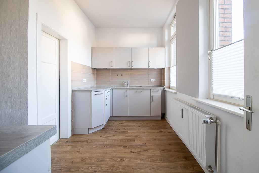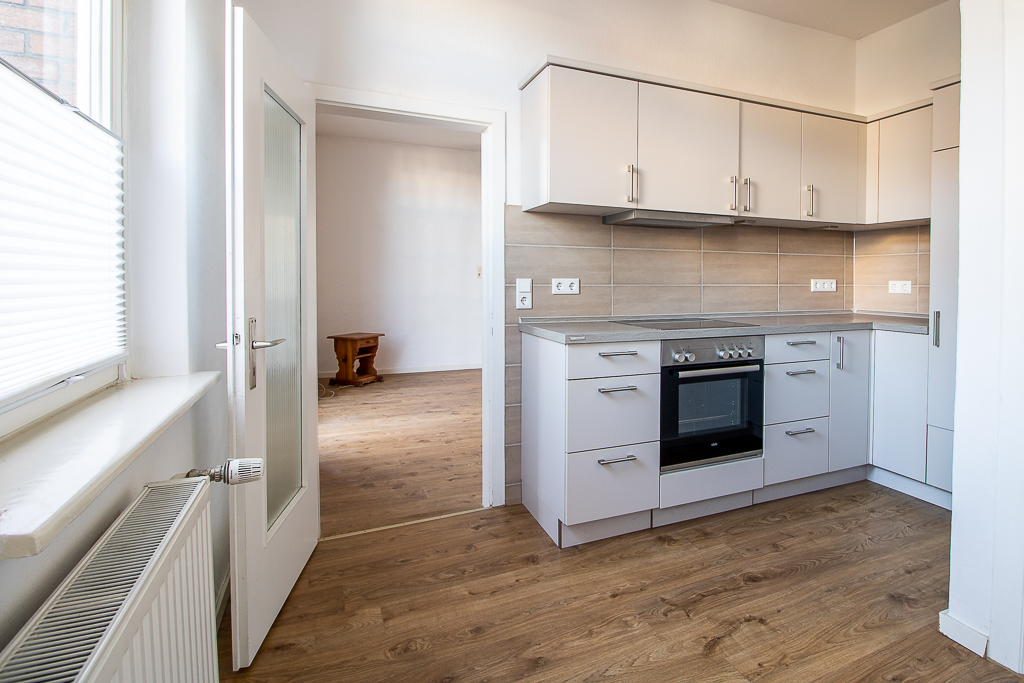 In den Wohnräumen sorgen Bodenbeläge in Holztönen in Kombination mit weißen Innentüren für eine angenehme Wohnatmosphäre. Sämtliche Räume wurden frisch weiß gestrichen. Die Küche ist mit einer modernen Einbauküche ausgestattet, die sich harmonisch in das Gesamtbild einfügt. Ein angrenzender Vorratsraum bietet zusätzlichen, praktischen Stauraum.