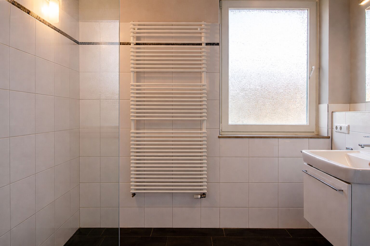 • Badezimmer mit bodentiefer Dusche, Handtuchheizung, Badezimmermöbeln und Fenster