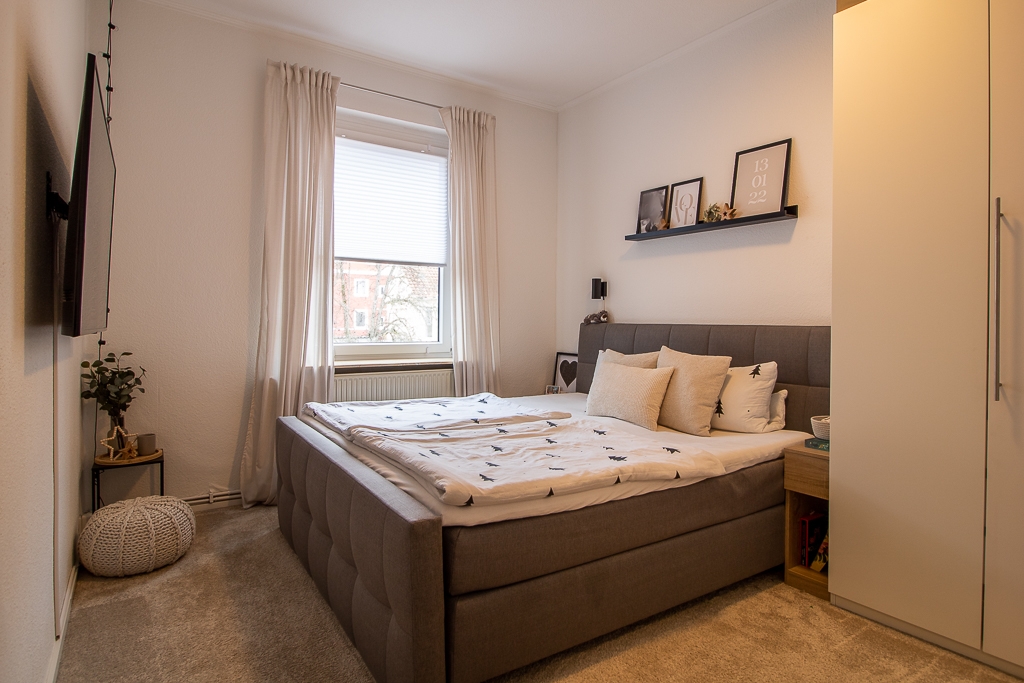 Ein großzügiges Wohnzimmer, ein gut geschnittene Schlafzimmer sowie ein kleineres Zimmer, das als Büro genutzt werden kann, ergänzen den durchdachten Grundriss und bieten vielfältige Nutzungsmöglichkeiten.