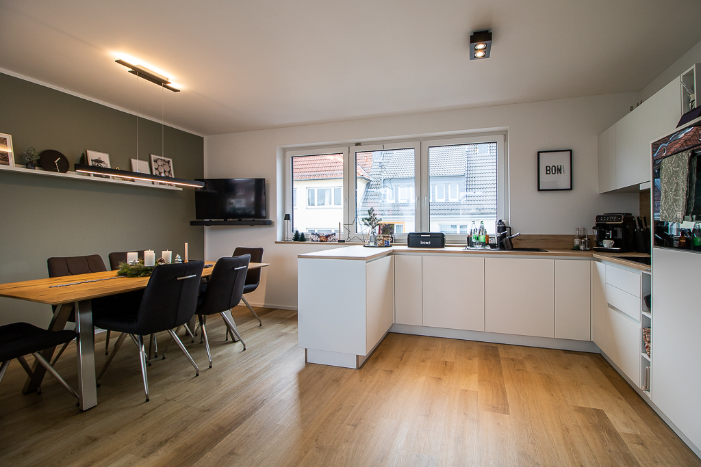 Der Mittelpunkt der Wohnung ist die großzügige Wohnküche mit einer neuen, hochwertigen Einbauküche und direktem Zugang zur Dachterrasse – ein idealer Ort für entspannte Stunden im Freien.