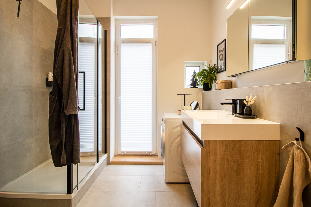 Das Tageslichtbad präsentiert sich ebenfalls vollständig erneuert und hochwertig ausgestattet: großformatige Fliesen, eine stilvolle Echtglas-Duschabtrennung, moderne Badezimmermöbel sowie ein kleiner Balkon, der dem Raum zusätzliche Offenheit und Licht verleiht.